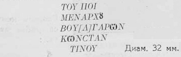 Гози печатъ на лицето има образа на светецъ правъ (Св. Стефанъ?) и отстрани полуизтритъ нидписъ, който поне азъ не можахъ да прочета, нито това е можалъ да стори отъ оригинала покойния Мюнстербергъ.