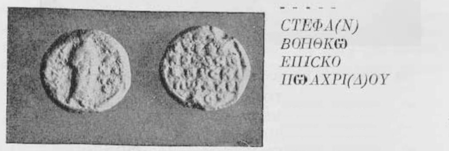 Презъ 1924 г. излѣзе отъ печатъ моя трудъ „Монетитѣ и печатитѣ на българскитѣ царе". Единъ екземпляръ бѣхъ изпратилъ на своя приятель, сега покойникъ Р. Мюнстербергъ, тогава директоръ на нумизматическия кабинетъ при Виенския музей. Мюнсгербергъ, като видѣлъ въ моя трудъ отдѣла „Византийски печати съ значение за българската история" сѣтилъ се, че въ Виенския музей има нѣколко оловени печати съ сѫщото значение и ми изпраща отпечатъци отъ осемь такива печати, между които и описанитѣ по долу два печата, които иматъ значение освенъ за българската история специално и за Охридската архиепископия.