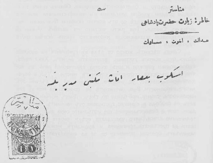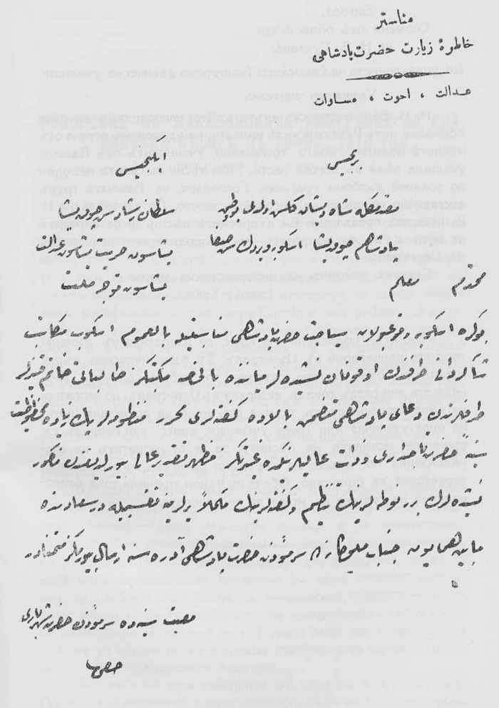 Н. И. Величество султанътъ, който напоследъкъ направи обиколка низъ Румелийскитѣ виляети, най-доволенъ остана отъ пѣснитѣ-молитви, които госпожици ученичкитѣ отъ Вашето училище пѣха въ негова часть. Тѣзи пѣсни съ своитѣ мелодии до толкова дьлбоко трогнаха Господаря, че Вашиятъ трудъ достатъчно се оцени на височайше мѣсто. По заповѣдь на Н. Величество, предлагаме Ви въпроснитѣ пѣсни да се наредатъ на ноти и да се изпратятъ въ императорската канцелария въ Цариградъ.