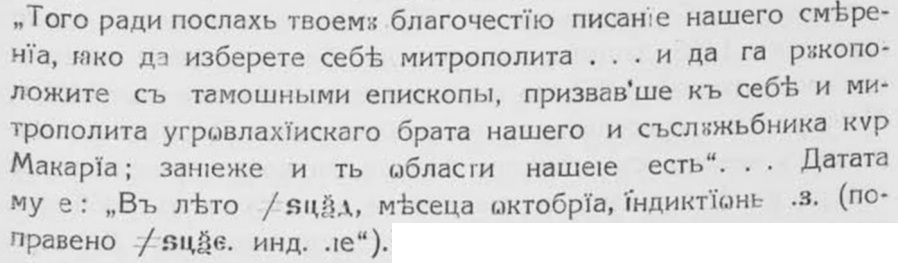 Сега да се върнемъ къмъ ония подробности въ писмата, които възбуждатъ съмнение. Едни отъ тѣхъ, именно споменуването на влашки (угровлахийски) митрополитъ Макарий и твърдението, че и той зависѣлъ отъ охридския архиепископъ, не представя голѣма мѫчнотия, защото, както забелязва и Яцимирски, имената на румънскитѣ иерарси отъ онази епоха сѫ малко известни, а единъ непознатъ по-отблизу Макарий се споменува въ изворитѣ около 1480 година. По-голѣма мѫчнотия съставя годината 6964 (= 1456) вмѣсто 6974 = 1466) и въ дветѣ писма, защото