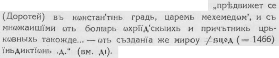 ко сръбскыи епископь съи ѿнѣкъдѹ наскочи на цръковь тѫ. [1] Яцимирски мисли [2], че подъ „сръбски патриярхъ" трѣбва да се разбира охридския ; но това е погрѣшно: макаръ че молдавцитѣ сѫ наричали въ по-подирно време и охридската църква „сръбска", цариградската патрияршия никога не е правила това. Важното е, че първитѣ сѫ получили отъ патр. Матея предупреждение да не се обръщатъ къмъ сръбския патриярхъ. Близу следъ половина вѣкъ въ Молдавия се явила нова борба съ Цариградъ. Въ 1447 г. митрополитътъ на тази държава Дамиянъ умрѣлъ. Въ ноемврий сѫщата год. византийскиятъ императоръ (Иоанъ VIII), който билъ призналъ флорентийската уния, издалъ заповѣдь (πρόσταγμα), препечатана въ статията на Ласкариса (стр. 31), съ която заповѣдь, въ съгласие съ патриярха, изпраща агатополския епископъ Иоакимъ за молдавски митрополитъ съ право да рѫкополага и втори архиерей (μετὰ καὶ τῆς τοῦ ἱεροῦ συνθρόνου ἐγκαθιδρύσεως).