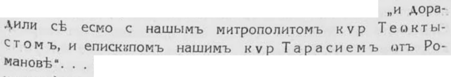 (7), който отпосле е поправенъ на ie (15), както и трѣбва да бѫде. — Втора подробность, която буди недоумѣние, е името на починалия митрополитъ — Висарионъ. Въ 1466 г. още е билъ живъ сучавскиятъ митрополитъ Теоктистъ, който, както се спомена, се е поминалъ въ 1477 г. Въ сѫщото време въ Романъ е билъ епископъ Тарасий. И единиятъ, и другиятъ често се споменуватъ въ
