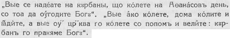 За другитѣ гръцки, a така сѫщо тракийски елементи въ българската служба ще кажемъ по-долу. А сега относно това праздненство и сръбската слава ще забележимъ, че тѣ съдържатъ въ себе си и елементи много по-стари отъ гръцкото и римско въздействие — елементи общославянски, праславянски. Това е култътътъ на прадѣдитѣ, елементи отъ жертвоприношението на почитания прадѣдо, покровитель на дома и рода. Мотивътъ поменаване на умрѣлитѣ е основенъ мотивъ на тѣзи праздненства у сърбитѣ и българитѣ. Предметитѣ, които иматъ обредно значение въ тѣзи праздненства, иматъ отношение къмъ култа на умрѣлитѣ, къмъ тѣхното поменаване. Нѣкои отъ тѣзи елементи сѫ претърпѣли известно измѣнение подъ влияние на черквата и на мѣстната културно-етническа обстановка. Но употрѣбението на огъня, на горящитѣ аромати, на хлѣба, на варенитѣ хлѣбни зърна, на меда, на водата, на кръвьта не се е явило резултатъ само