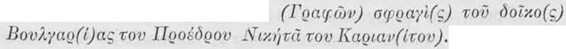 Обаче сѫщото не можà да стане съ втората половина отъ надписа, която е на спакото. Отъ името на стопанина на печата, което е на последния редъ на опакото, сѫ запазени само буква N и лѣвата половина отъ буква Н или I. Като сѫдя по тѣзи букви и по разстоянието на праздното мѣсто, дохаждамъ до убеждение, че тѣзи букви сѫ началнитѣ на името NHCHTA или NICHTA. Върху предидещия печатъ това име е написано NICHTA. Обаче и дветѣ форми еднакво се срѣщатъ. Освенъ това предидущиятъ печатъ на Никита Кариецъ ни подсказва, че и този печатъ трѣбва да е на сѫщия Никита, който изглежда преди да е билъ проедъръ, архиепископъ и дукъ на България е билъ монахъ въ нѣкой манастиръ, името на който е заличено, и сетне е станалъ архиепископъ на българитѣ.