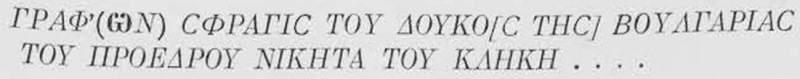 , a въ нашия печатъ е BOVΛГАРІАС, както това се вижда отъ разстоянието между буквитѣ. За жалость и нашиятъ печатъ на това мѣсто не е съвсемъ добре запазенъ, но това може да се твърди съ положителность, както това се вижда и отъ фотографическата снимка.