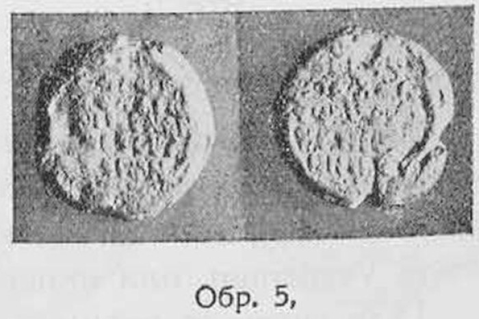 3. Другъ печатъ на сѫщия. Този печатъ е дѣлъ, но е твърде зле запазенъ. Обаче отъ това, което можахъ да прочета, дохаждамъ до заключение, че той е еднакъвъ съ горния, затова не преписвамъ неговия надписъ, a само давамъ отъ него фотографическа снимка. Диам. 18 мм. Обр. 5.