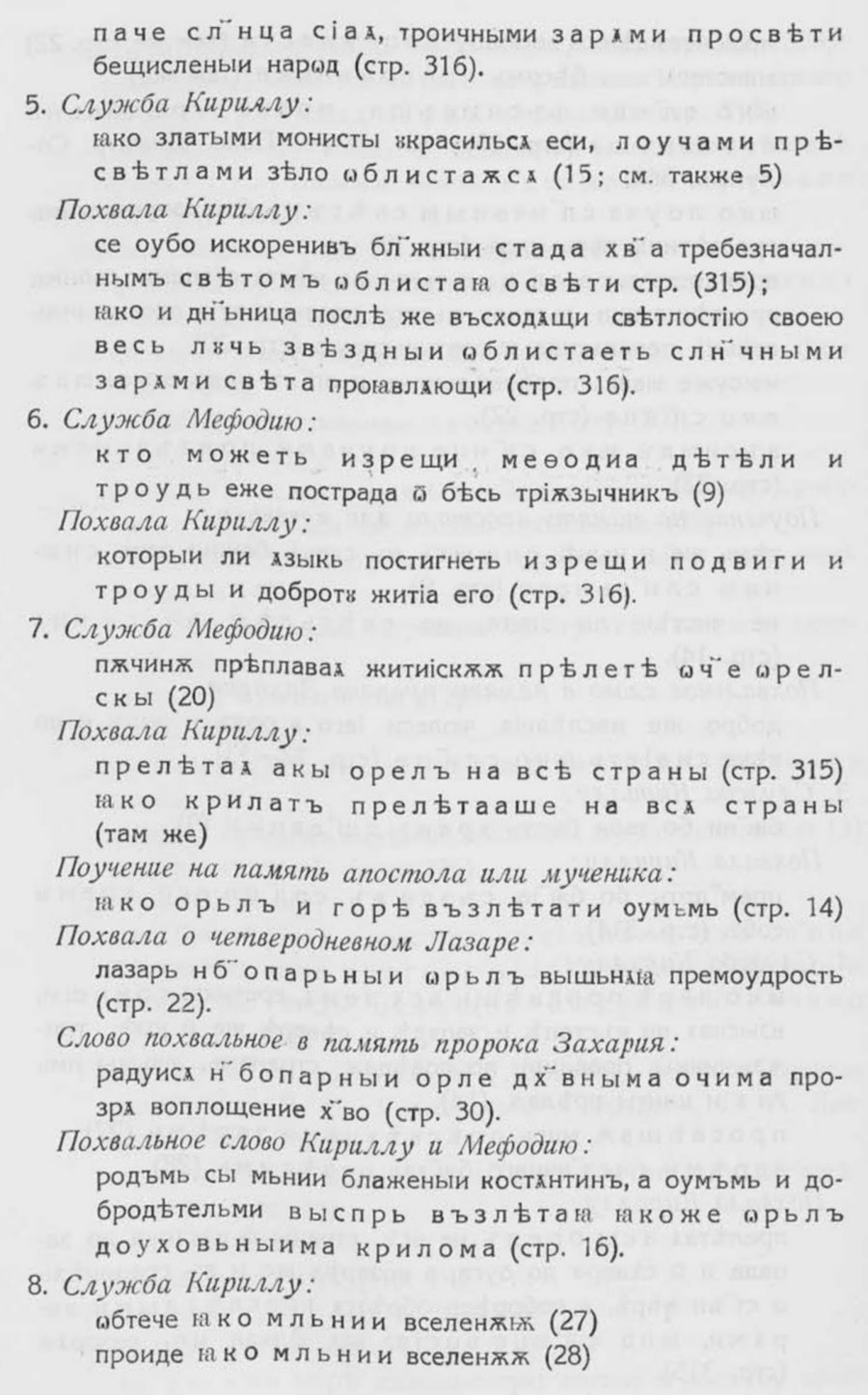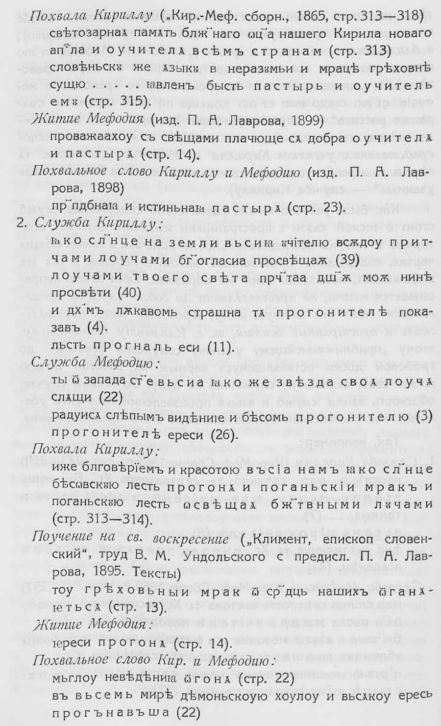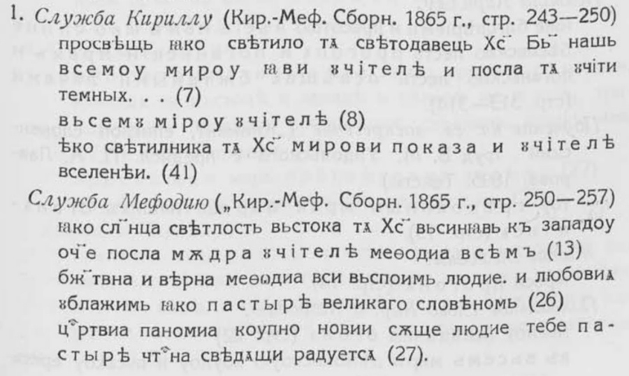 Из последующей затем литературы по интересующему нас вопросу отметим еще мнение акад. А. И. Соболевского, который, исходя из наблюдений над языком памятника, отнес православные службы Кириллу и Мефодию, если не целиком, то частично, к древнейшим памятникам моравского происхождения (Р. Ф. В. 1900, № 1—2) [1].