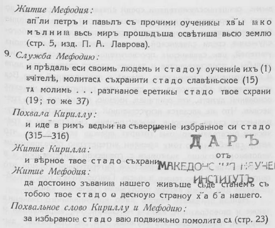 Прежде всего, следует отметить, что как Похвала Кириллу, так и службы обоим братьям и особенно служба Мефодию носят ярко выраженную печать славянской идеологии. В них Кирилл и Мефодий чествуются не только как „учители странам", „всему миру" или „вселенней", но и как пастыри и учители славянского народа ; в них возносятся мольбы о сохранении „стада" славянского, т. е. имеется в виду церковный клир славянский. Конечно, подобное настроение вполне возможно и в сподвижниках славянских просветителей не славянского происхождения. Но ведь „стадо"-то, организованное Кириллом в Моравии и сопровождавшее его в Рим, а затем явившееся на местах преемниками солунских братьев и первыми