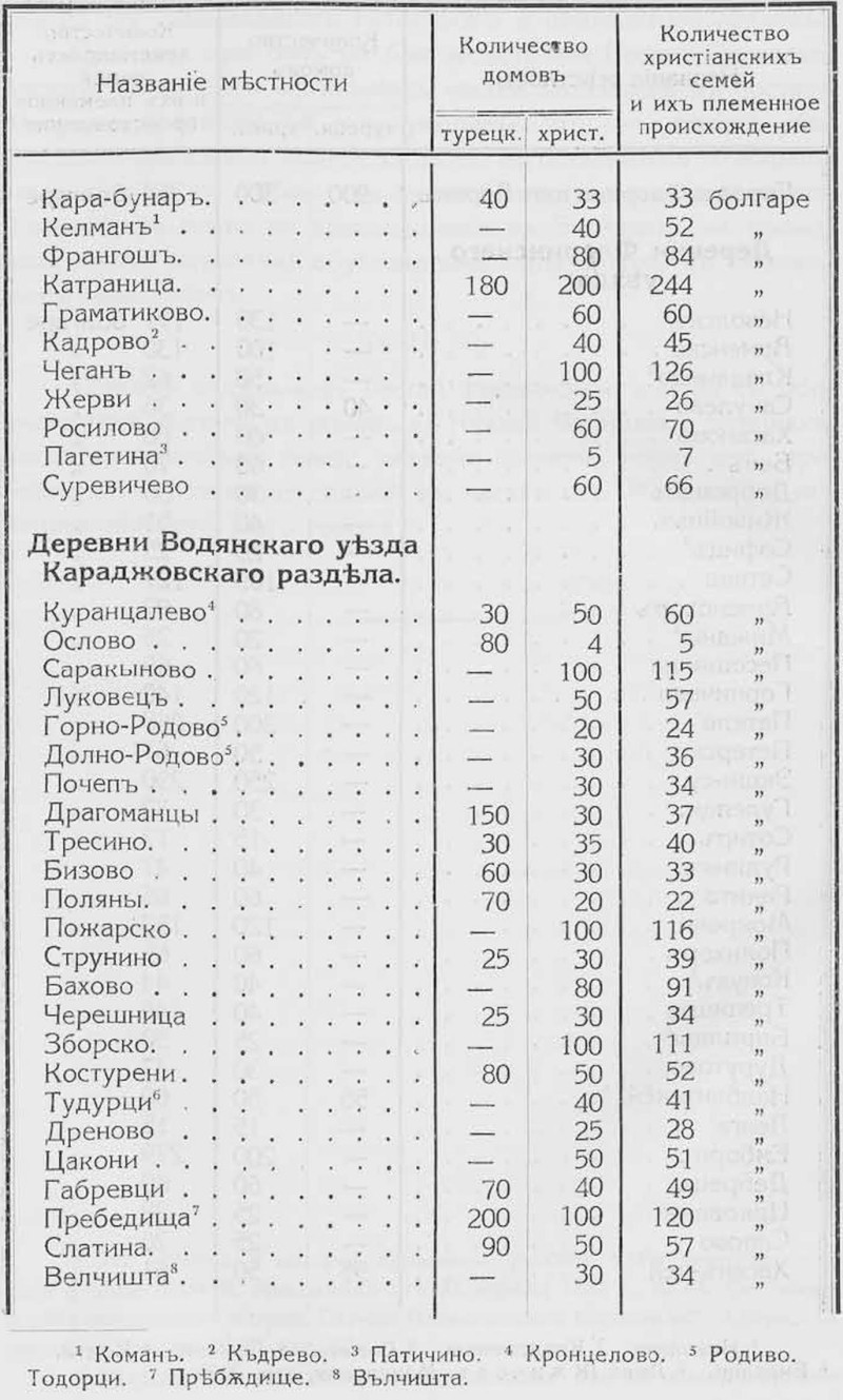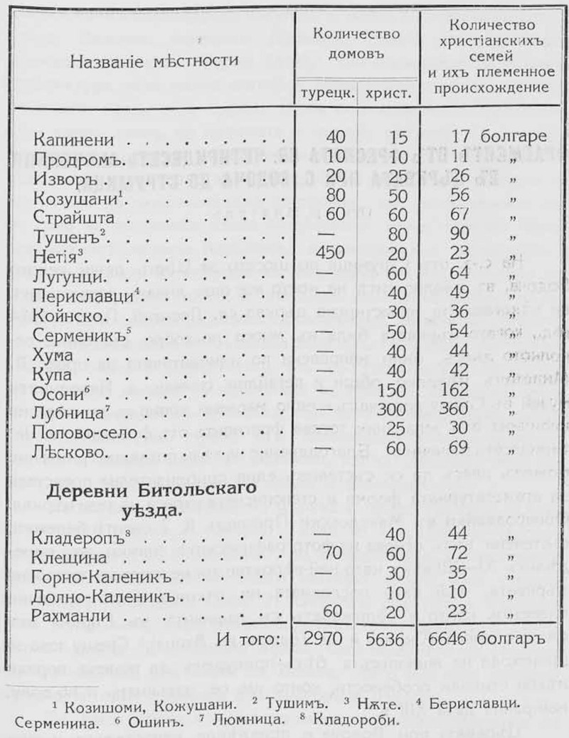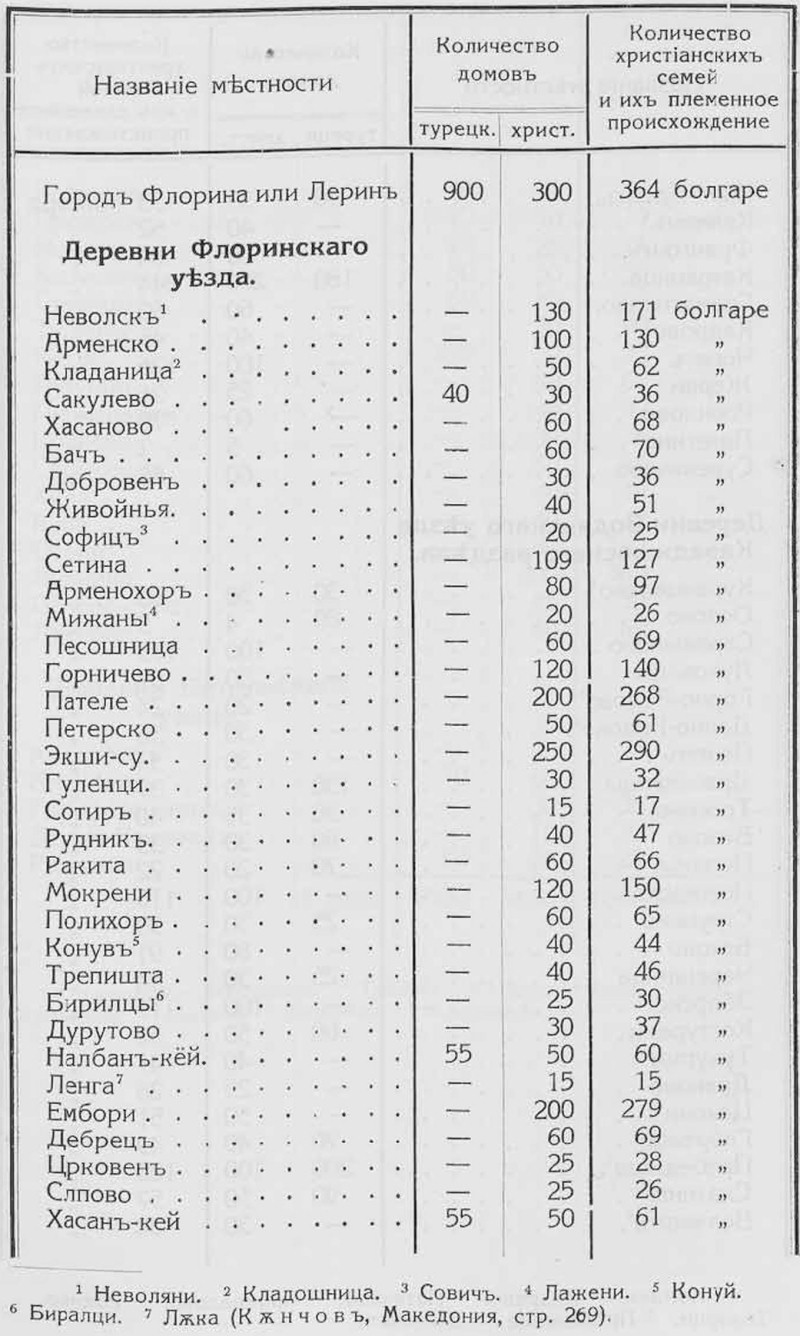 Не лишена значения и статистическая таблица, приложенная к последнему документу и представляющая перечень болгарских домов в Леринском крае и в соседних местностях на востоке и юге (в Воденском, Гевгелийском, Енидже-Вардарском, Кайлярском, Костурском районах). Сведения эти не вполне точны. Так, в Караджове, — в селах Лугунци, Бериславци, Койнско, Серменина, Хума, Купа, Ошин, Люмница (Лубница) показаны только болгары, а не отмечено влашское население: по сведениям 1890-х гг., в этих селах находилось только влашское население. Повидимому, в рубрику „болгары" зачислены сторонники болгарской церкви, независимо от национальности их. Но в селе Нетія (Нѫте) показаны „валахи", 23 семьи. 450 домов этого села внесены в рубрику: „турецкие дома", В 1890-х п. там находилось 3500 человек влахов-мусульман и 160 цыган [2]. Не отмечено в ряде сел и турецкое население.