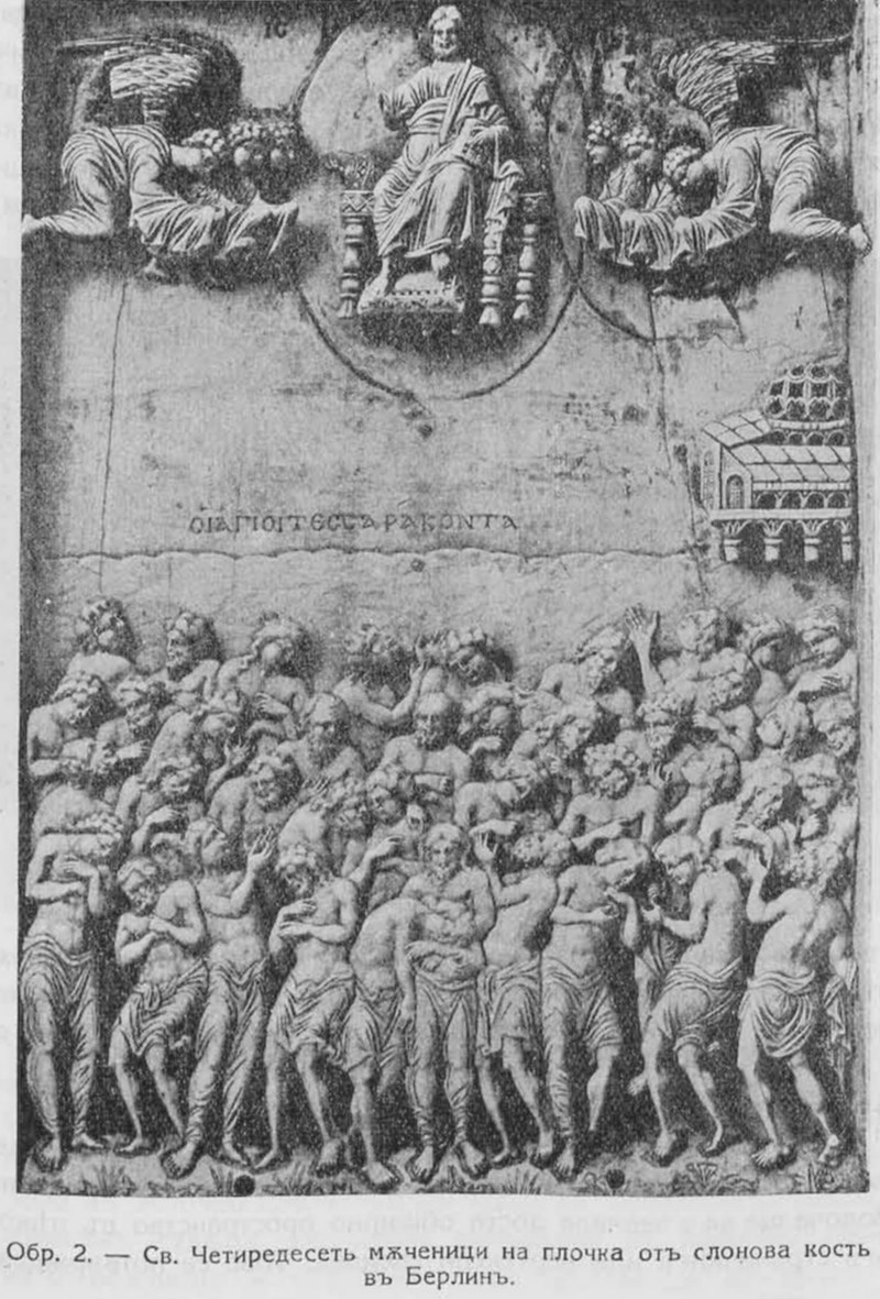 на четиридесетьтѣ мѫченици е билъ разпространенъ въ Цариградъ още въ V в. [1] Ние не знаемъ, доколко този сюжетъ е билъ изписванъ въ цариградскитѣ църкви, но за неговото сѫществуване и за разпространението на култа въ столицата свидетелствуватъ издѣлия на слонова кость като плочката въ Берлинския Kaiser Friedrich-Museum № 574 отъ X в. (обр. 2) [2] и единъ триптихъ въ Петроградската сбирка на Шуваловъ отъ XI в. [3] Въ по-старитѣ стенописи извънъ Цариградъ ние намираме сюжета само единъ пѫть въ Кападокия (пещерна църква въ Сувехъ) [4], два пѫти въ Русия (баптистерий на Св. София въ Киезъ отъ XI в. [5] и църквата Св. Теодоръ Стратилатъ въ Новгородъ отъ XIV в.) [6], нѣколко пѫти въ Сърбия (Студеница — XII в., [7] обр. 3, Жича — 1222—1228 г., [8] обр. 4. Сапочани — 1250-1270 г.; Градацъ — 1290 г.; Дечани — XIV в., обр. 5). Въ Македония той се явява въ църквата Св. София въ Охридъ [9] и въ Лѣсновския манастиръ (обр. б) отъ XIV в. [10], а може