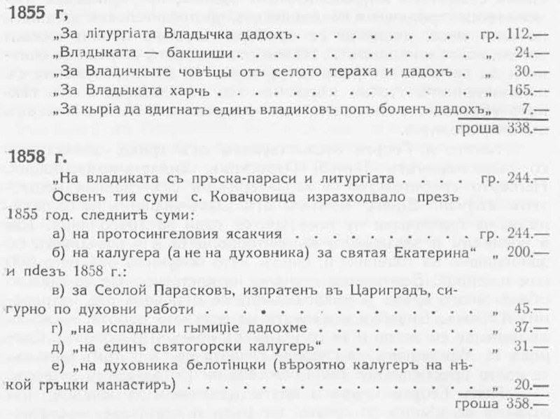 неизвестно. Отъ смѣткитѣ, които учительтъ Н. Ив. Ковачевски е държалъ и отъ които заемаме горнитѣ данни, се вижда, какви суми Ковачевица е плащала на гръцкия владика и на други лица. Така, това село имало 199 цѣли венчила и 32 полувенчила (вдовци и вдовици), за които плащало по 4 гр. на венчило и по 2 гр. на полувенчило, всичко 860 гр. годишно. Владиката посѣтилъ това село 1855 и 1858 г., за които посещения то платило:
