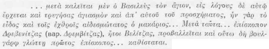 Откуда же именно? Отвечая на этот вопрос, Туницкий обращает внимание, что в списке епископий, носящем имя Льва Мудрого, отмечены две под именем Βελικείας. Из них одна входит в число епископий фракийской филиппопольской митрополии, а другая в митрополию македонскую филипскую. Мало того! По свидетельству того же каталога, в филиппопольской митрополии находилась еще кафедра Δραμίτζα, название которой, по мнению нашего ученого, и таится в искаженной форме Δρεμβίτζα. Полной уверенности, что обе формы представляют, в сущности, одно и то же слово, мешает только