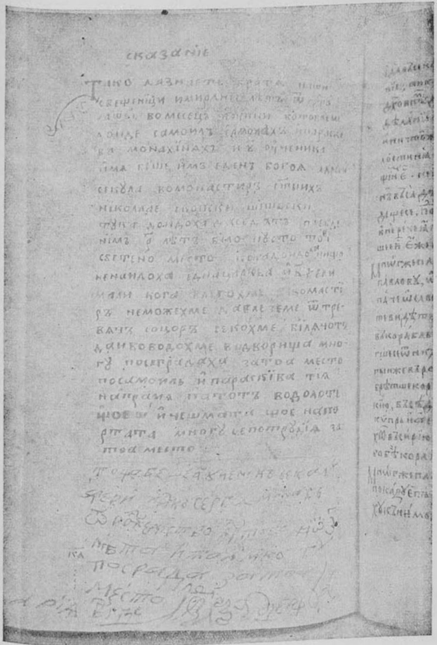 Запись сделана на одной из ненаписанных страниц большой рукописи, содержащей деяния апостольские с толкованиями Иоанна Златоуста (Публичная б-ка в Ленингр., F. I, 516). Рукопись была исполнена в ХѴІ-м веке. Оригиналом для нее служил один из списков, восходящих к переводу деяний, деланному в Болгарии в ХIѴ-м веке по желанию Иоанна Александра. Перевод был сделан