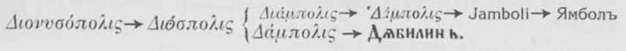4. Georgius Cedrenus, Hist., Bonnae, t. 11, стр. 59620: Δάμπολις; Annae Comnenae Alexiadis, Bonnae, t. I, стр. 3339 (lib. VIII, 2): Δάμπολις (въ нѣкои рѫкописи — Διαμπύας); Georgii Pachymeris, De Michaele et Andronico Palaeologis, Bonnae, t. II, стр. 5594 (lib. VI, 35 отъ De Andronico Palaelogo): Ὑάμπολις ; Joannis Cantacusemi Hist. Bonnae, t. I, стр. 29416, 32410, 4316, 46315,21, 4647: Διάμπολις ; Ив. Сакѫзовъ, Новооткрити документи отъ края на XIV вѣкъ за българи отъ Македония, продавани като роби, въ Македонски прегледъ, год. VII. кн. 2-3, стр. 48: Diamboli.