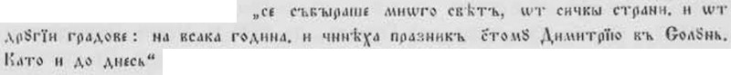 2. Макаръ и джамия, църквата „Св. Димитъръ" въ Солунъ била още тачена. Въ 1704 г. иером. Иеротей Рачанински, сърбинъ, на пѫть за Иерусалимъ е миналъ презъ Солунъ и видѣлъ, че поклоиници се мажели съ миро, което е текло отъ единъ стълпъ до вратата на тая църква. Подъ стълпа била гробницата на великомѫченика (Ст. Новаковић, Прилози к историји српске књижевности, Гласник српског ученог друштва, XXXI, стр. 301). Въ едно новобългарско житие на св. Димитъръ Солунски отъ първата половина на XVIII в. — плодъ на високия култъ у българитѣ къмъ светеца — се казва, че