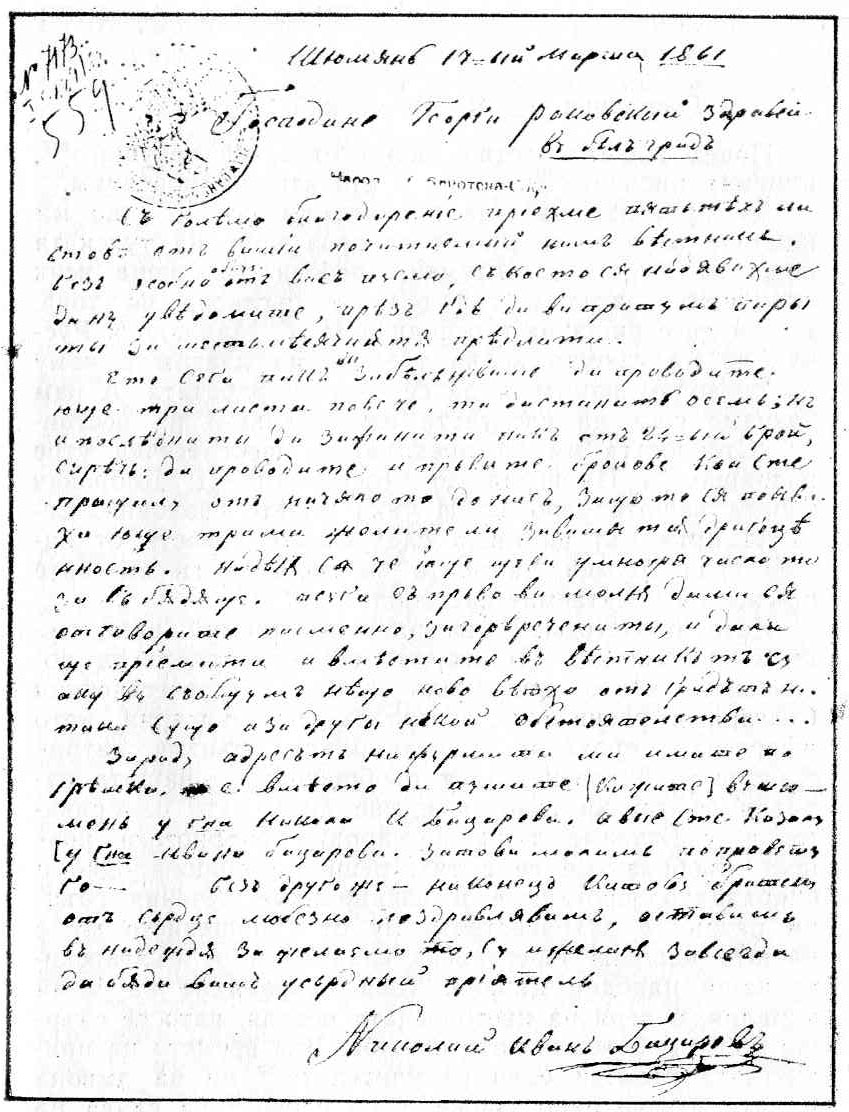 Тъй като не можах да се стърпя, потрудих се, пригласих и склоних на мойто намерение още трима-четир[и]ма приятели. Затова сега ви моля, като приемните настоящето ми, с първа поща да ми изпроводите от почитаемия ваш вестник Д[унавски] л[ебед] 5 (пет) листове през господ[ин] Ива[н] Мавриди в Русчук право за в Шумен с надпис до нази (до: Николай Иван Бацаров), който адрес ще наместите при другите си настоятели [175]. Забележете, че като приема първите 5 листа, с първото ви известие през кого ще ви пратя 5 (петтях) жълтици за първа шестомесечна предплата. Речените 5 жълтици са у мене готови, но понеже не знаех отгде да ви ги упътя, затова оставих да чакам вашето известие.