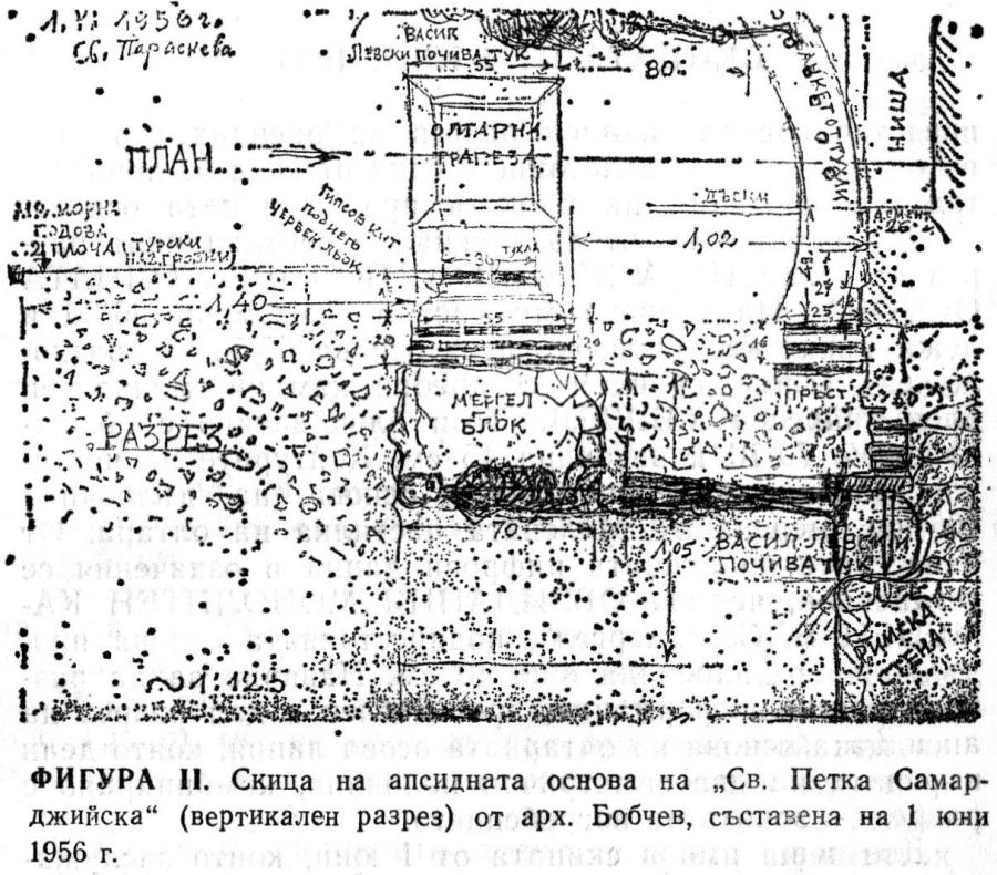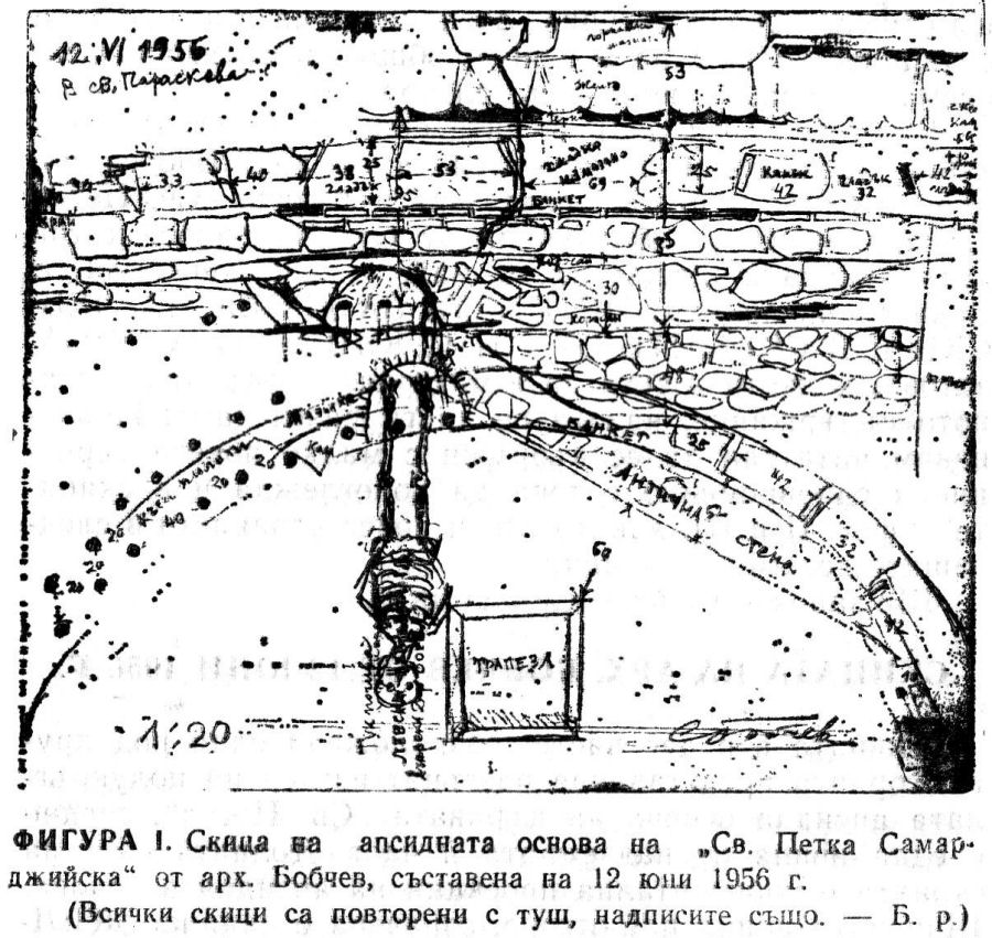 Фигура II. Скица на апсидната основа на „Св. Петка Самарджийска“ (вертикален разрез) от арх. Бобчев, съставена на 1 юни 1956 г.