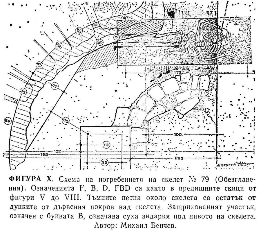 Фигура X. Схема на погребението на скелет № 79 (Обезглавения) 172