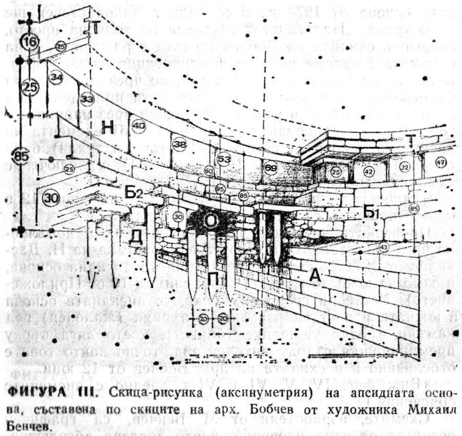Фигура III. Скица-рисунка (аксинуметрия) на апсидиата основа, съставена по скиците на арх. Бобчев от художника Михаил Бенчев