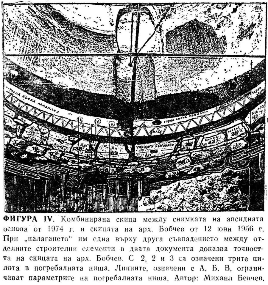 Фигура IV. Комбинирана скица между снимката на апсидната основа от 1974 г. и скицата на арх. Бобчев от 12 юни 1966 г.