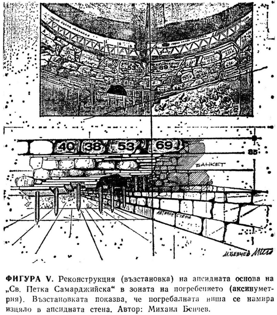 Фигура V. Реконструкция (възстановка) на апсидната основа на „Св. Петка Самарджийска“ в зоната на погребението (аксинуметрия)