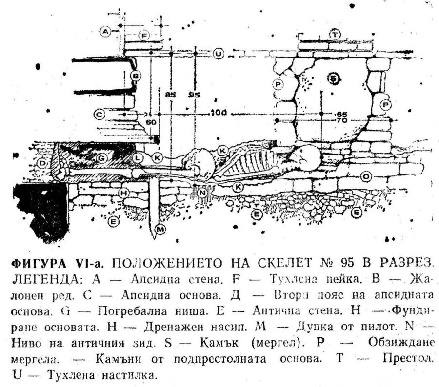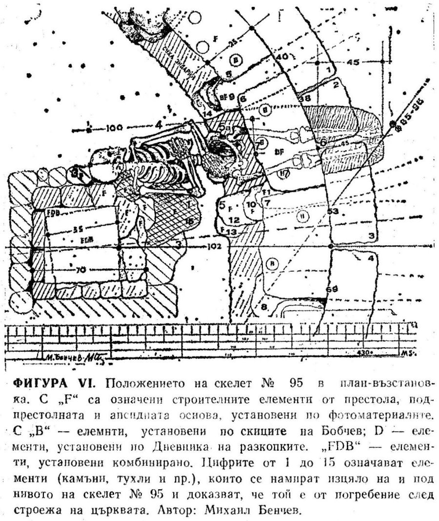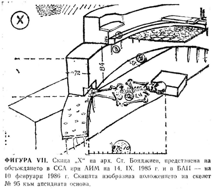 Фигура VII. Скица „Х” на арх. Ст. Бояджиев, представена на обсъждането в ССА при АИМ на 14. IX. 1985 г. и в БАН — на 10 февруари 1986 г. Скицата изобразява положението на скелет № 95 към апсидната основа
