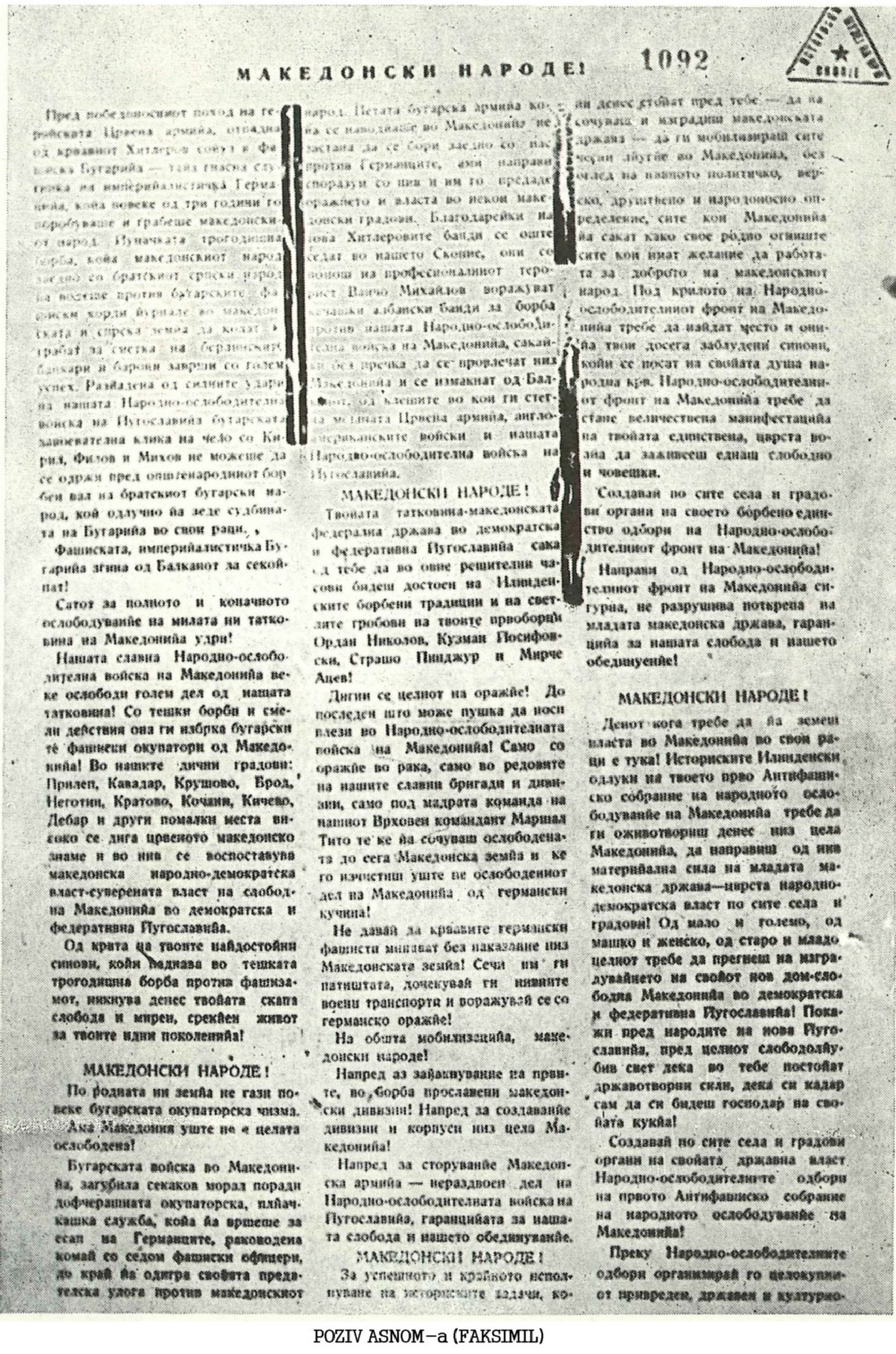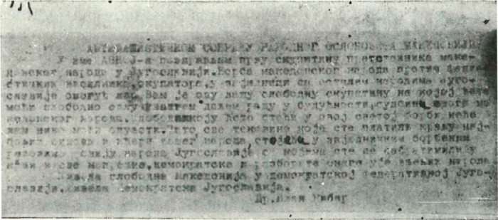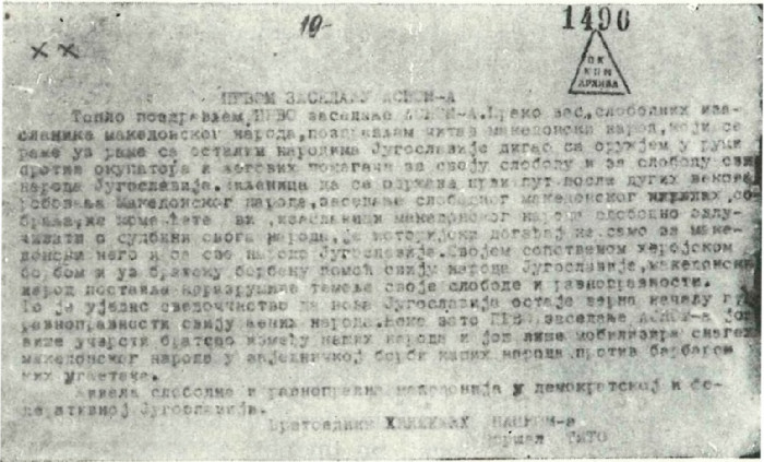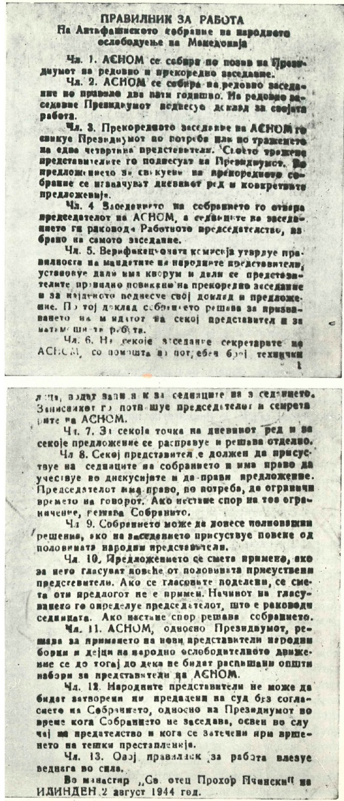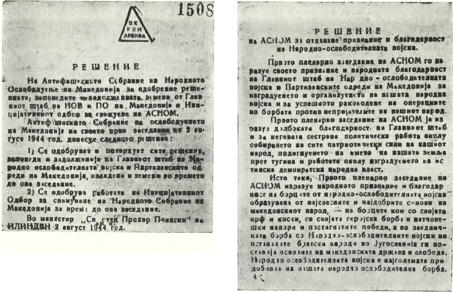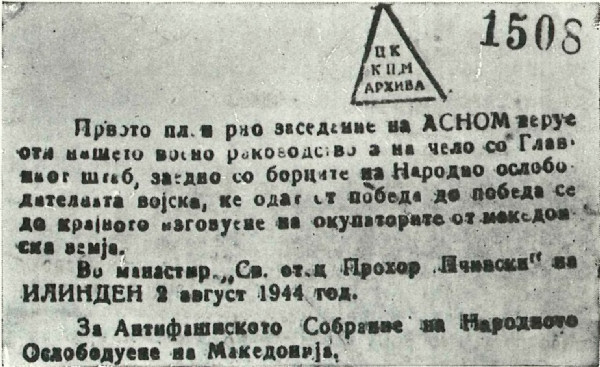 Pobedu od najvećeg istorijskog značaja makedonski narod je izvojevao proklamovanjem makedonske države — Narodna Republika Makedonija u okviru Federativne Narodne Republike Jugoslavije — na svom prvom zasedanju ASNOM-a, 2. avgusta 1944. godine, u manastiru Prohor Pčinjski. Ovaj istorijski događaj pokrenuo je sve snage makedonskog naroda u borbu protiv fašističkih okupatora. Do kraja 1944. godine Makedonija je bila potpuno oslobođena. Makedonske jedinice NOV i POJ pobedonosno su produžile borbu do konačnog oslobođenja Jugoslavije.