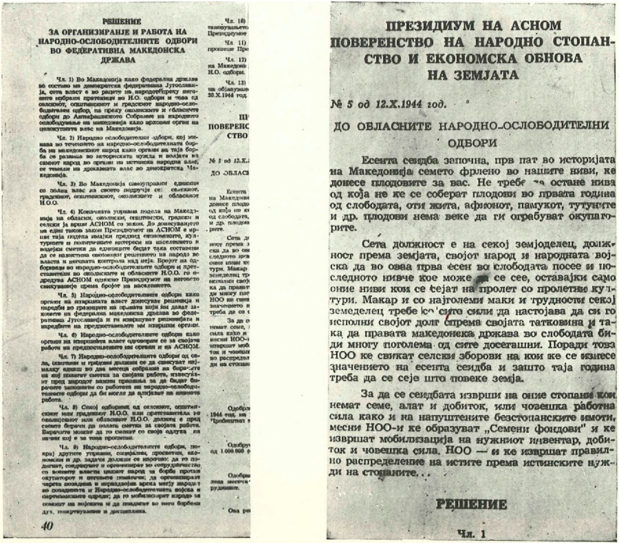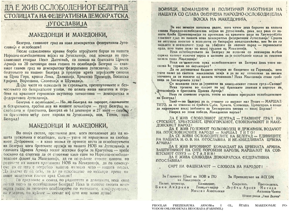 Do kraja 1944. godine Makedonija je bila potpuno oslobođena. U oslobođeno Skopje pobedonosno su ušli i najviši politički i vojni organi narodnog ustanka Makedonije — CK KPM, ASNOM, i Glavni štab Makedonije, koji su neumorno produžili svoj rad na izgradnji nove narodne zajednice i obnovi opustošene zemlje. U decembru 1944. godine, u oslobođenom Skopju bilo je održano i I vanredno (drugo) zasedanje ASNOM-a, na kome su donete značajne odluke za dalju izgradnju države.
