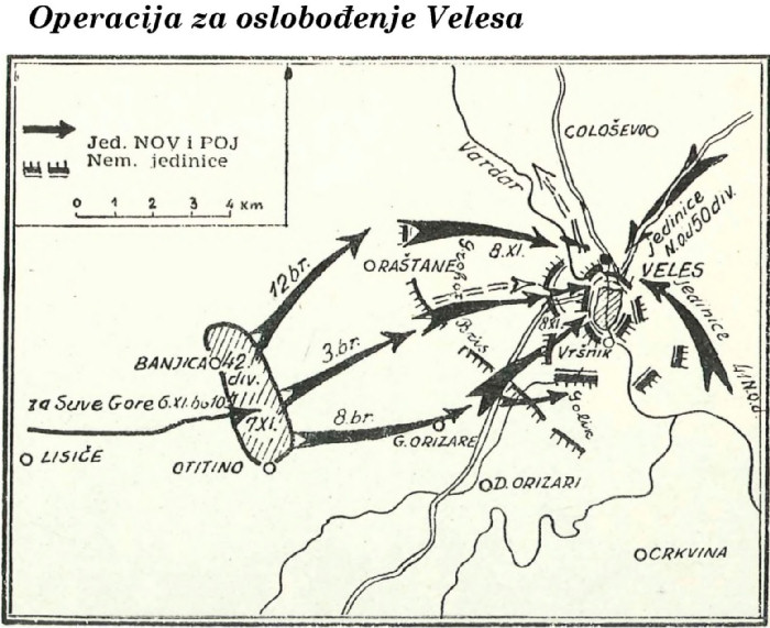Po oslobođenju Velesa, 42. i 50. narodnooslobodilačka divizija, pod komandom 16. korpusa NOV i POJ, upućene su bez zadržavanja ka Skopju.