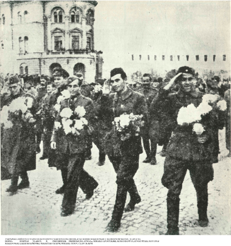 S LEVA NA DESNO: DIMITAR VLAHOV, P. PREDSEDNIK PREZIDIJUMA AVNOJ-a. MIHAILO APOSTOLSKI, KOMANDANT GLAVNOG ŠTABA NOV I POJ MAKEDONIJE, LAZAR KOLIŠEVSKI, SEKRETAR CK KPM, STRAHIL GIGOV, CLAN CK KPM