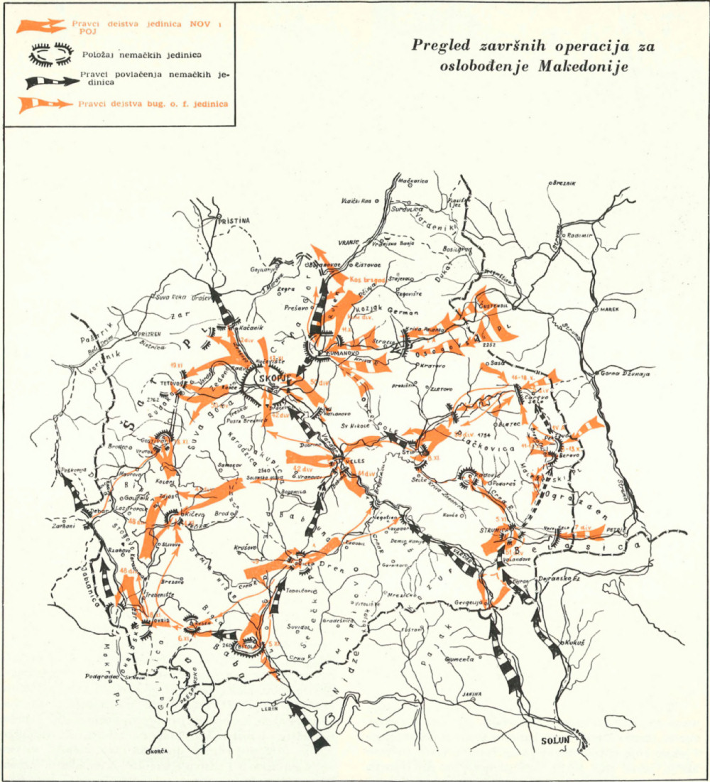 Na karti je prikazana poslednja etapa završnih operacija za oslobođenje Makedonije. Na njoj su, pored pravaca dejstva jedinica NOV i POJ, označeni pravci kojima su dejstvovale jedinice otečestveno-frontovske bugarske armije. Takođe, na karti su označeni glavniji nemački položaji, na kojima su vođene borbe. Obeleženi su i pravci kojima su se povlačile nemačke jedinice.