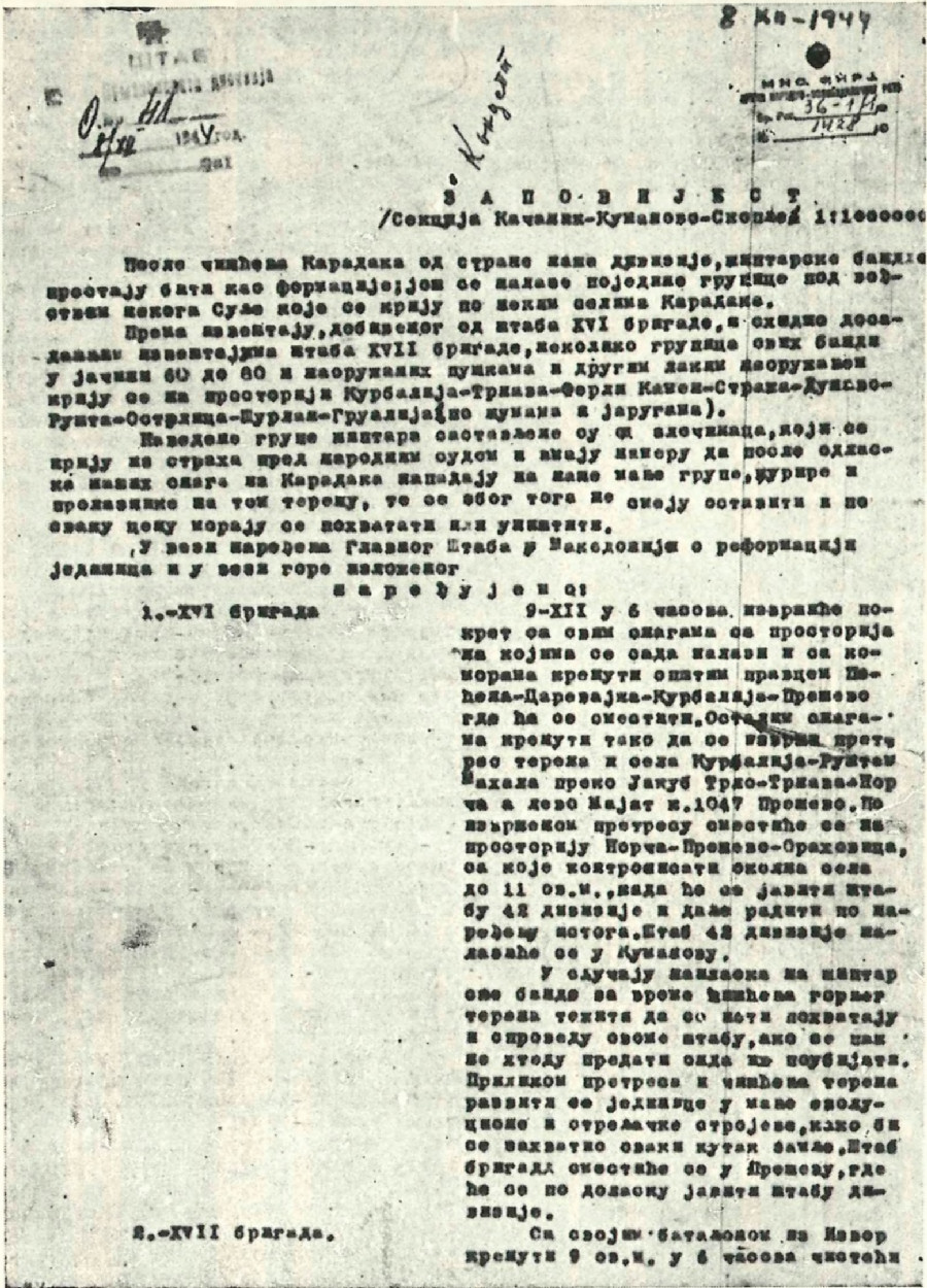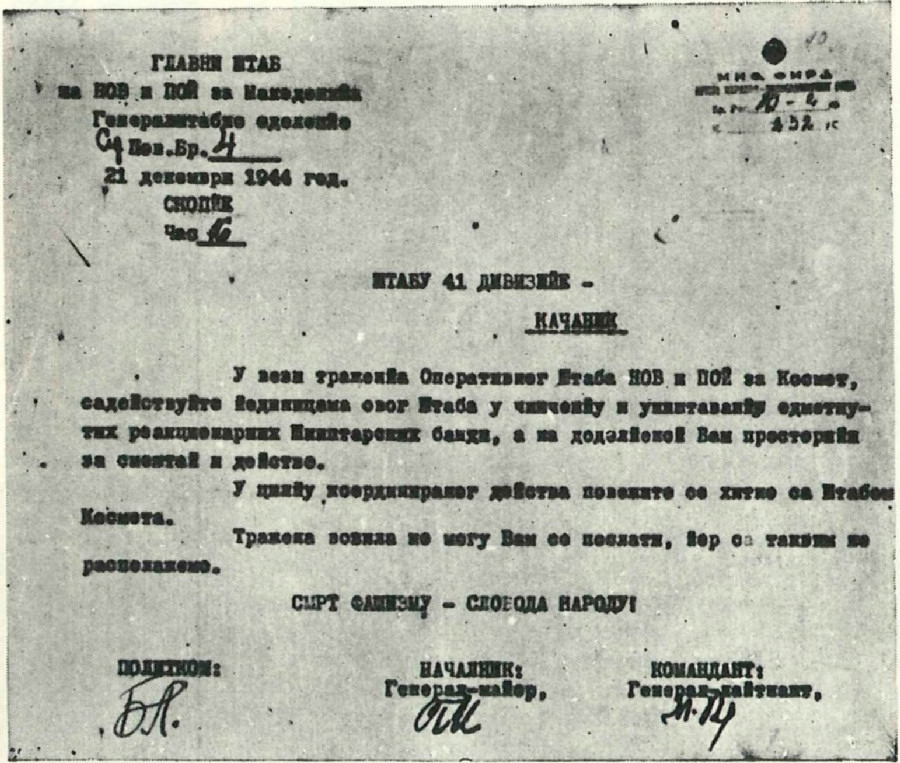 — Treća grupa bataljona da se probije kroz istočnu Makedoniju da bi izbila na teren Kumanova i Vranja u cilju spajanja sa partizanskim jedinicama koje su dejstvo vale u tom rejonu.