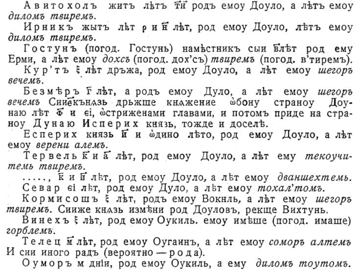 «Если же судить о сих именах вообще, то заметим, — пишет Венелин, — что г. Энгель из длинного списка болгарских исторических лиц, в коих везде виден их славянизм, несмотря на некоторые изменения под пером греческим, выбрал те, которые исковерканы более всех, и посему сделались невразумительными и необъяснимыми, по его мнению, из славянского языка».