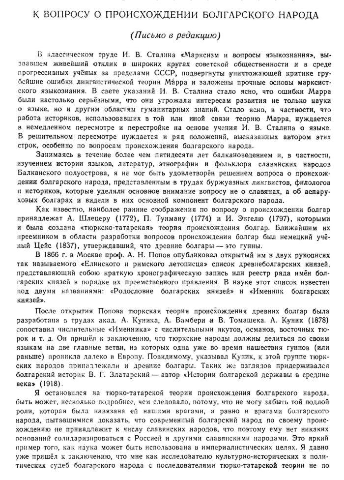 В классическом труде И. В. Сталина «Марксизм и вопросы языкознания», вызвавшем живейший отклик в широких кругах советской общественности и в среде прогрессивных учёных за пределами СССР, подвергнуты уничтожающей критике грубейшие ошибки лингвистической теории Марра и заложены прочные основы марксистского языкознания. В свете указаний И. В. Сталина стало ясно, что ошибки Марра были настолько серьёзными, что они угрожали интересам развития не только науки о языке, но и другим областям гуманитарных знаний. Стало ясно, в частности, что работа историков, использовавших в той или иной связи теорию Марра, нуждается в немедленном пересмотре и перестройке на основе учения И. В. Сталина о языке. В решительном пересмотре нуждается и ряд положений, высказанных автором этих строк, особенно по вопросам происхождения болгарского народа.