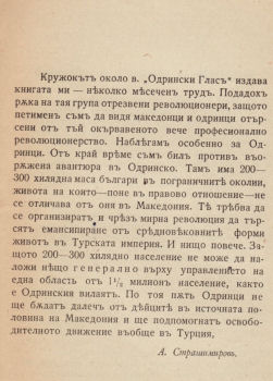 Кружокътъ около в. „Одрински Гласъ” издава книгата ми — нѣколко мѣсеченъ трудъ. Подадохъ рѫка на тая група отрезвени революционери, защото петименъ съмъ да видя македонци и одринци отърсени отъ тъй окървавеното вече професионално революционерство. Наблѣгамъ особенно за Одринци. Отъ край врѣме съмъ билъ противъ въорѫжена авантюра въ Одринско. Тамъ има 200—300 хилядна маса българи ръ пограничнитѣ околии, живота на които — поне въ правово отношение — не се отличава отъ оня въ Македония. Тѣ трѣбва да се организиратъ и чрѣзъ мирна революция да търсятъ емансипиране отъ срѣдновѣковнитѣ форми животъ въ Турската империя. И нищо повече. Защото 200—300 хилядно население не може да наложи нѣщо генерално върху управлението на една область отъ 1 1/2 милионъ население, както е Одринския вилаятъ. По тоя пѫть Одринци не ще бѫдатъ далечъ отъ дѣйцитѣ въ источната половина на Македония и ще подпомогнатъ освободителното движение въобще въ Турция,