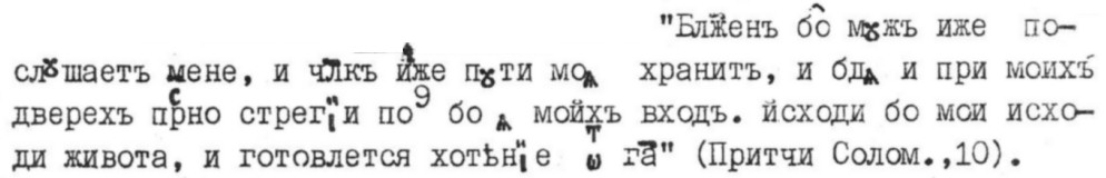 и частично оригинальных главным образом староболгарских книг. См., напр., отрывок из "Жития Сергия Радонежского": "И изведше съ старцем, поставила пред ним брашно. Старець же вкуси брашна, благослови родители его и хотяше отити. Родители же его моляху старцу, въпрашаюце его и глаголюще: "Отче господине! Пожди еще да въпрашаем тя... Сие смиренное отроча наше, его же благословяеши и хвалословиши, о нем же много блага предглаголеши..." и отрывок из "Библии 1581 г.": "і-ако десницею покрые(т) ихъ, и мышцею защитить и(х). и прїиметь орȣжїе ревности его, и въорȣжено сътворитъ създанїе на мщенїе врагомъ. и облечетъ въ бронѧ, правды, и обложить шле(м) сȣда истинна" (Прем.Солом., 5).
