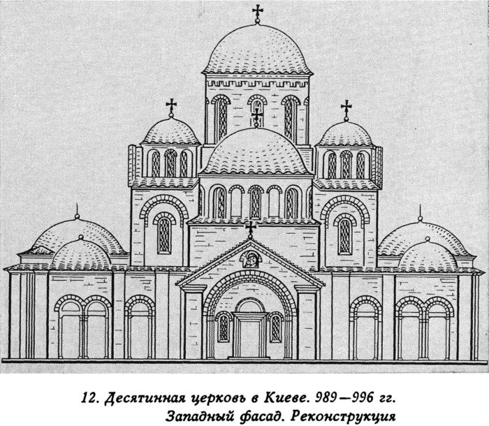 12. Десятинная церковь в Киеве. 989—996 гг. Западный фасад. Реконструкция Н. В. Холостенко. Из кн.: Килиевич С. Р. Детинец Киева IX - первой половины XIII в. Киев, 1982. С. 58. Рис. 34