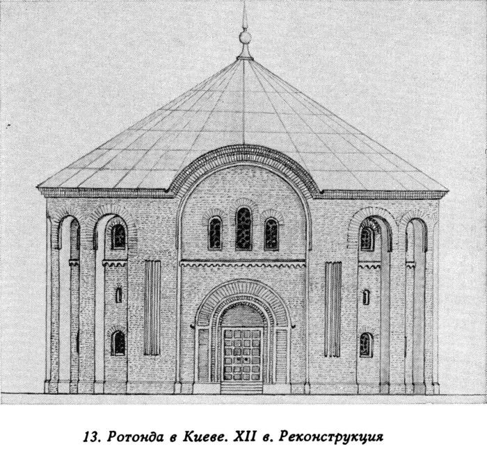 13. Ротонда в Киеве. XII в. Реконструкция П. П. Толочко, Я. Е. Боровского и В. С. Шелягова. Из кн.: Килиевич С. Р. Детинец Киева IX— первой половины XIII в. Киев, 1982. С. 107. Рис. 72.