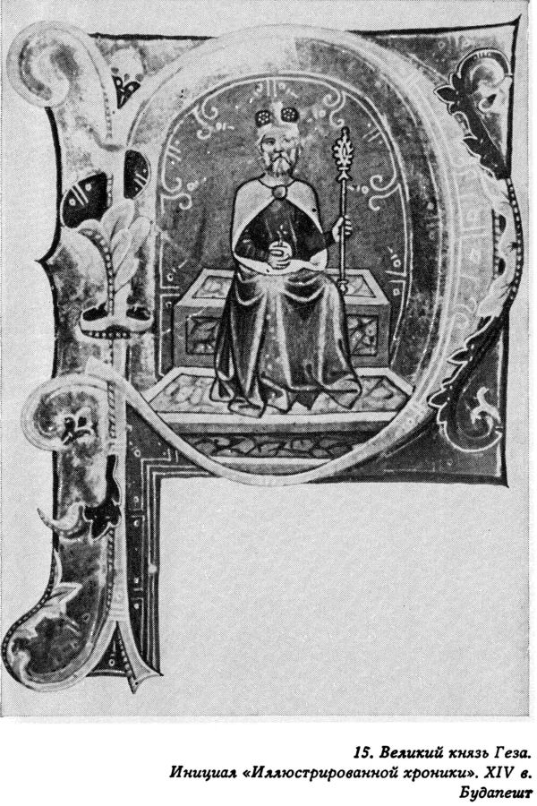15. Великий князь Геза. Инициал «Иллюстрированной хроники» XIV в. Будапешт, Государственная библиотека им. Сеченьи. Из кн.: Györffy Gy. István király és müve. Bp., 1977. 48-49. 1. № 11.