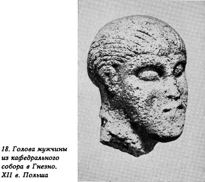 18. Голова мужчины из кафедрального собора в Гнезно. Гипс. XII в. Археологический музей в Гнезно. Польша. Из кн.: Katalog zabytków sztuki w Polsce. T. V. Cz. 3. Warszawa, 1963. Fig. 8.