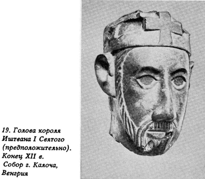 19. Голова короля Иштвана I Святого (предположительно) из собора г. Калоча. Конец XII в. Красный мрамор. Венгерский Национальный музей, Будапешт. Из кн.: Györffy Gy. István király és műve. Bp., 1977. 144—145. 1. № 18.