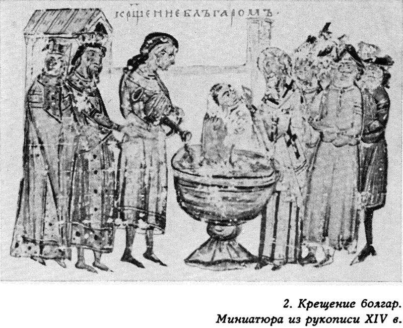 2. Крещение болгар. Миниатюра из рукописи «Манассиева хроника». 1344—1345 гг. Рим. Ватиканская библиотека. Собрание славянских рукописей. № 2. Из кн.: Джурова А. Българска ръкописна книга. София, 1981. Приложения. № 173.