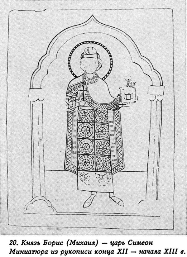 20. Князь Борис (Михаил) - царь Симеон (?). Миниатюра из рукописи «Слово Ипполита об антихристе». Конец XII — начало XIII в. Москва, Государственный Исторический музей. Чудовское собрание. № 12. Пергамент. Из кн.: История на българското изобразително изкуство. 1. София, 1976. С. 118. Рис. 136.