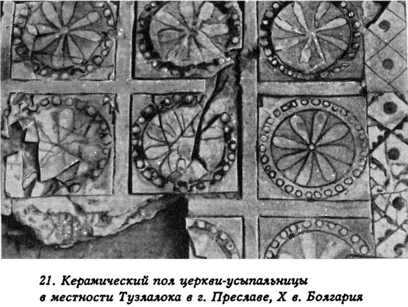 21. Керамический пол церкви-усыпальницы в местности Тузлалока в г. Преславе, Болгария. X в. Из кн.: История на българското изобразително изкуство. 1. София, 1976. С. 121, Рис. 140.
