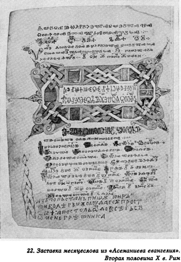 22. Заставка месяцеслова из «Асеманиева евангелия». Вторая половина X в. Рим. Ватиканская библиотека. Собрание славянских рукописей. № 3. Из кн.: Джурова А. Българска ръкописна книга. София, 1981. Приложения. № 12.