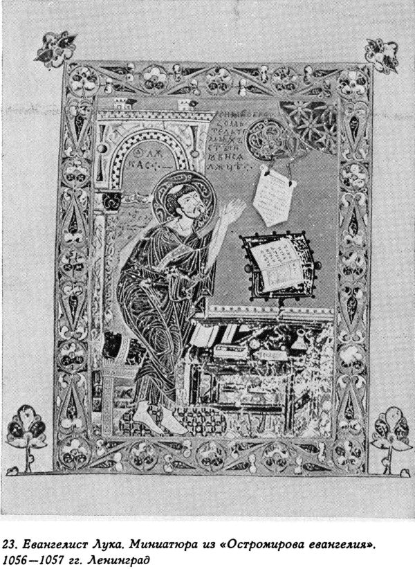 23. Евангелист Лука. Миниатюра из рукописи «Остромирово евангелие». 1056-1057 гг. Ленинград. Государственная Публичная библиотека им. М. Е. Салтыкова-Щедрина. Fn. 1.5. Пергамент. Из кн.: Джурова А. Българска ръкописна книга. София, 1981. Приложения. № 39.