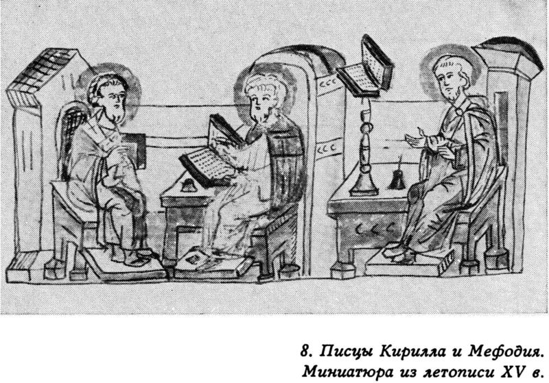 8. Писцы Кирилла и Мефодия. Миниатюра «Радзивилловской летописи». XV в. Ленинград. Библиотека АН СССР. № 34.5.30. Из кн.: Радзивиловская или Кенигсбергская летопись. I. СПб., 1902. Л. 14.