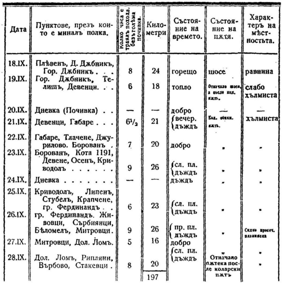 Дългиятъ пѫть на полка всрѣдъ незабравимитѣ сцени на посрѣщания и изпращания, минаващъ презъ поля и планини, въ горещини и дъждове се очърта споредъ на таблицата и схемата (стр. 20 и 21).