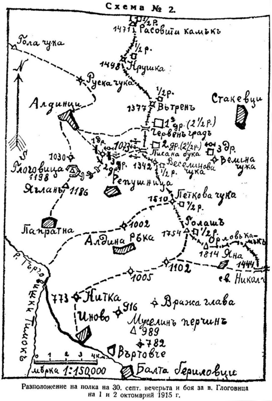 Отъ заловенитѣ пленици се узна, че полкътъ е билъ насоченъ срещу лѣвия флангъ отъ сръбската позиция, която е била заета отъ 1. баталионъ отъ 5. пехотенъ сръбски полкъ. По волята на сѫдбата трѣбвало е въ днешния бой полкътъ отново да примѣри силитѣ си съ сѫщия 5. сръбски полкъ, съ когото се срещна още презъ първия день отъ войната и отъ когото изтръгна първата крупна победа за нашата армия — тамъ, на Глоговица.