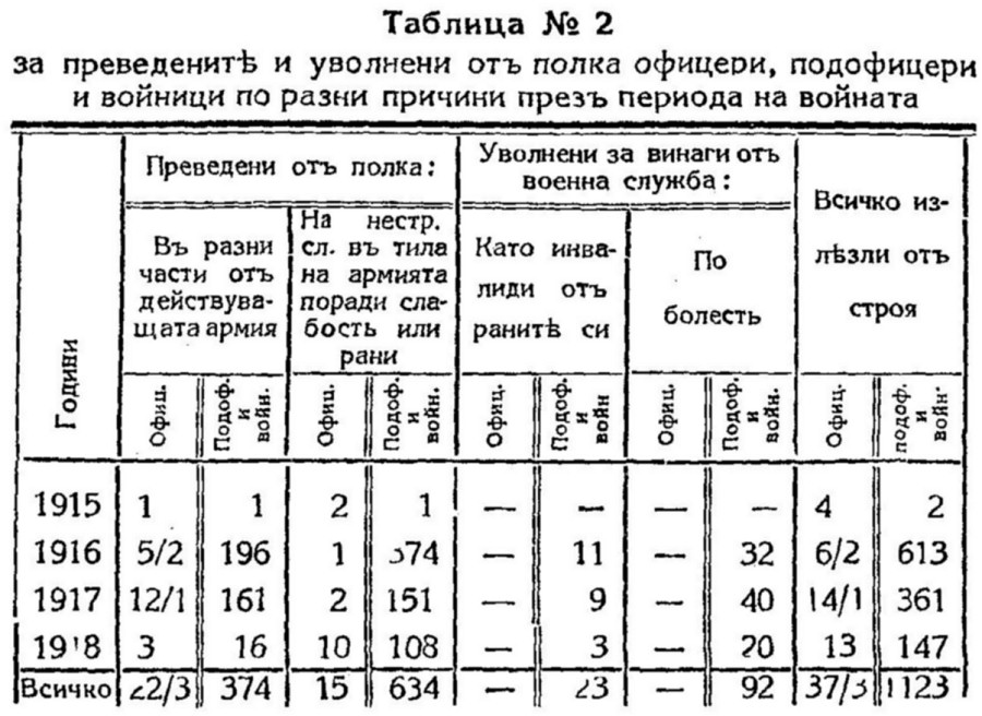 Въ таблица № 2 сѫ показани числата на тия отъ напустналитѣ полка офицери, подофицери и войници, които сѫ биди преведени отъ полка въ други части или сѫ били уволнени по разни причини.
